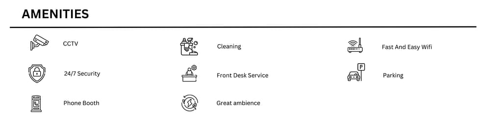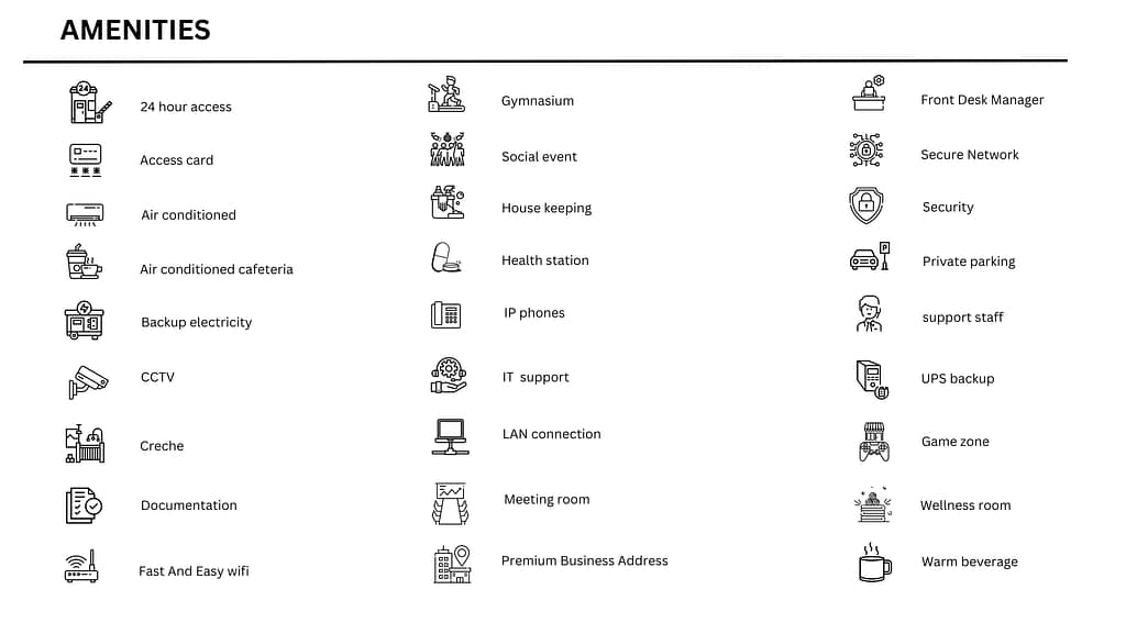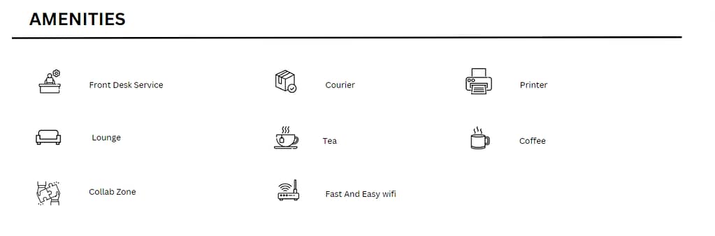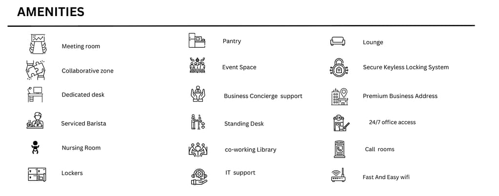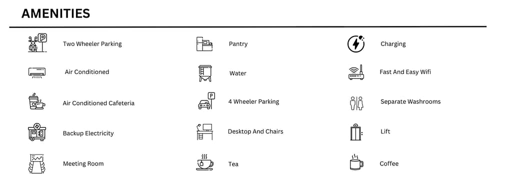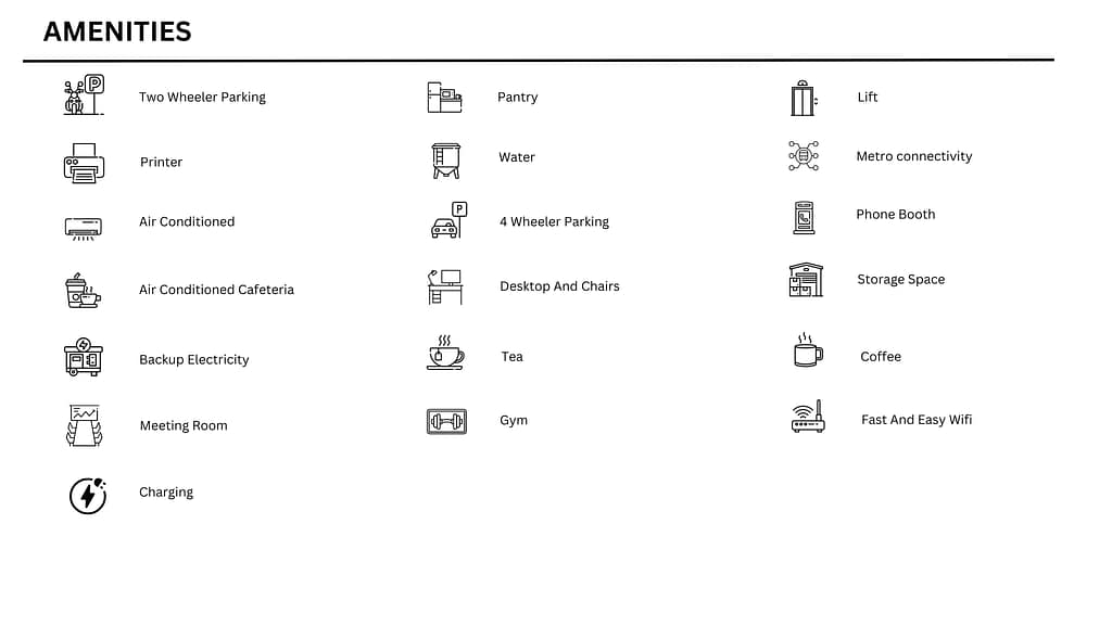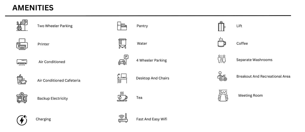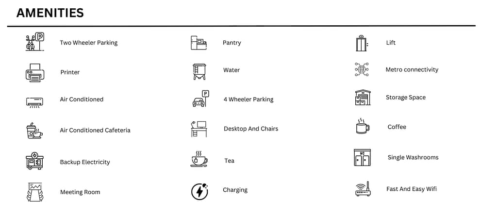 Office Type – Private Cabin, Fixed desk, Meeting Rooms, Multi Utility Space, Flexi Pass, Flexi Office.