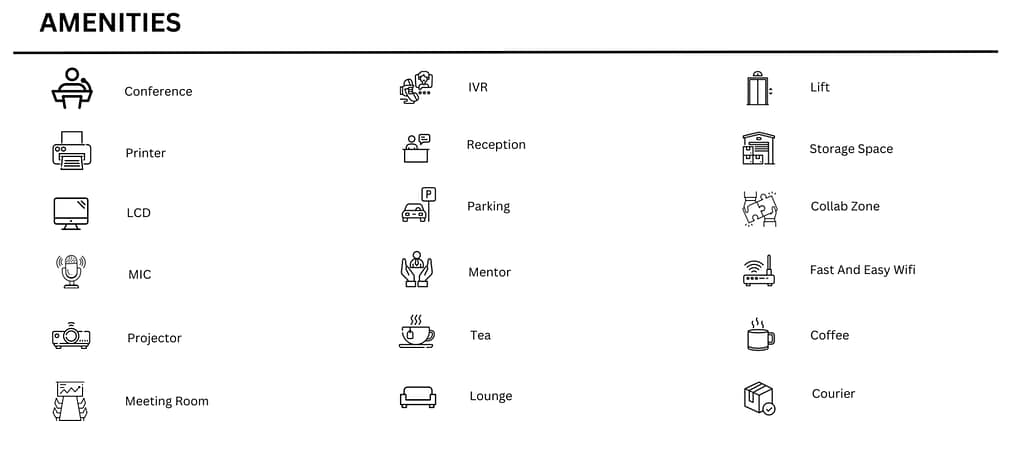 Office Type – Private Office Space, Private Cabins, Meeting Rooms, Dedicated desk, Virtual Office.